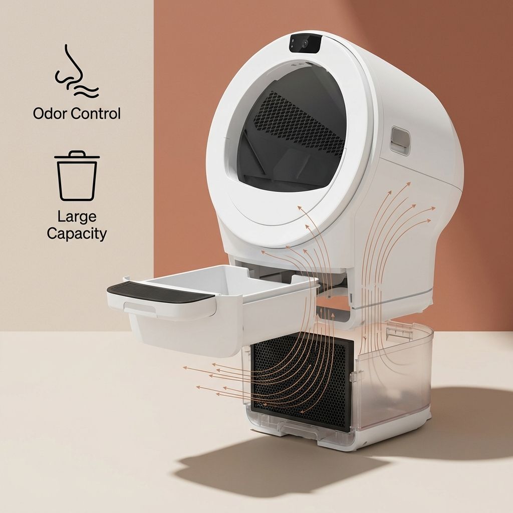 After every visit, the robot automatically sifts waste into the sealed drawer. You empty it once every 10 days with one cat. No more daily chores.