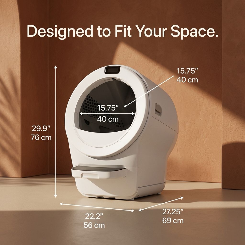 56 × 69 cm — identical to a traditional litter box but with more interior height (44.5 cm). Elegant full-color LCD display. Customizable LED lights. Blends into your home.